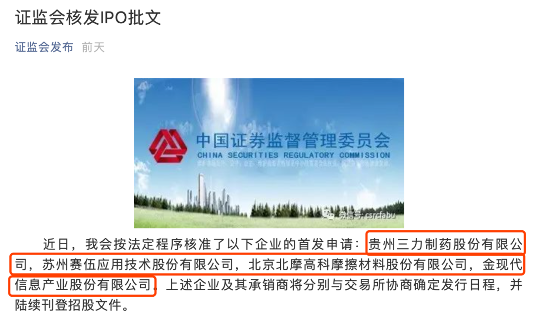 4月3日晚间,证监会核准了4家企业的IPO批文,分别为:贵州三力制药股份有限公司,苏州赛伍应用技术股份有限公司,北京北摩高科摩擦材料股份有限公司,金现代信息产业股份有限公司。上述企业及其承销商将分别与交易所协商确定发行日程,并陆续刊登招股文件。