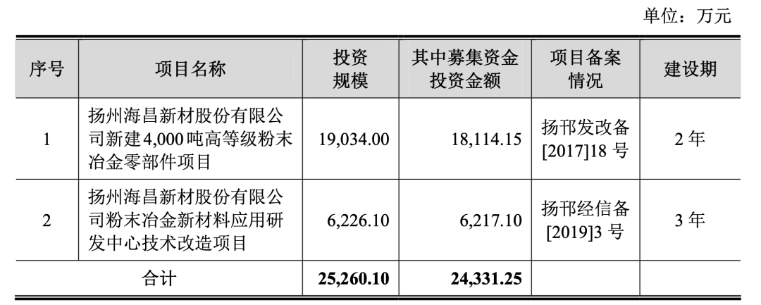 其募集资金2.43亿元,分别用于扬州海昌新材股份有限公司新建4000吨高等级粉末冶金零部件项目、扬州海昌新材股份有限公司粉末冶金新材料应用研发中心技术改造项目。