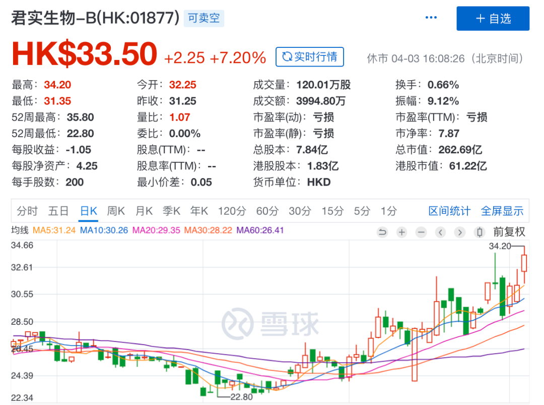 因申请在科创板上市,君实生物自2019年9月25日起于全国股份系统暂停买卖。停牌前,其股价收于35.41元/股,港股收于33.50港元/股,总市值超260亿元。