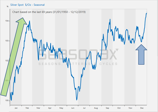 季节性趋势显示,白银(17 02,-0 03,-0 18%)和铂金倾向于从12月中旬开始强劲上涨,涨势往往会持续到2月底。新的一年即将到来之际,许多投资