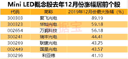 去年12月份相关概念股股价都获得了巨大上涨,三安光电、华灿光电、聚飞光电、万润科技、瑞丰光电等相关概念股连续多日走强。