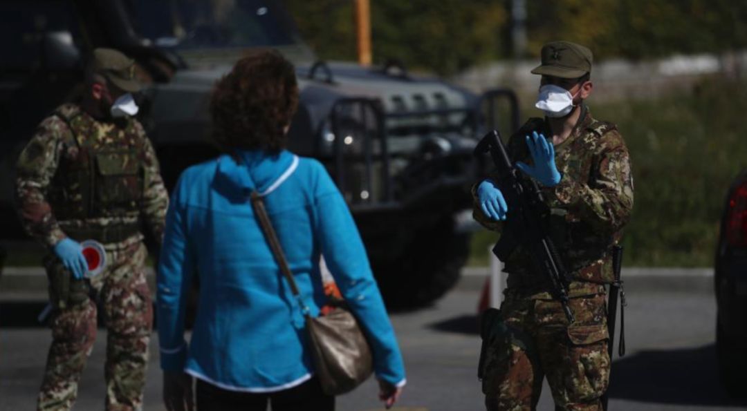 法国南部哨所,一名妇女被守卫法意边境的意大利士兵拦住。